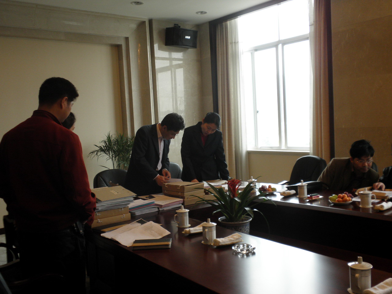 圖為市創(chuàng)建勞動關(guān)系和諧企業(yè)考評小組成員檢查相關(guān)資料