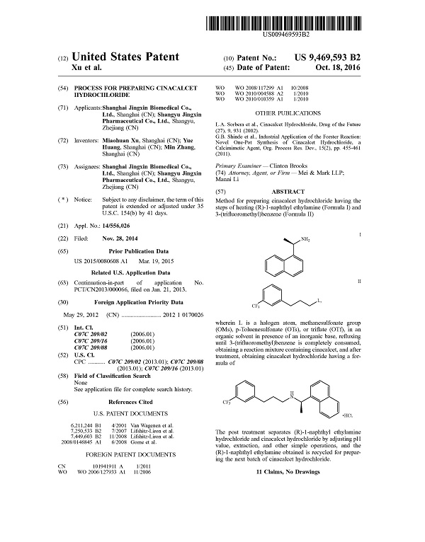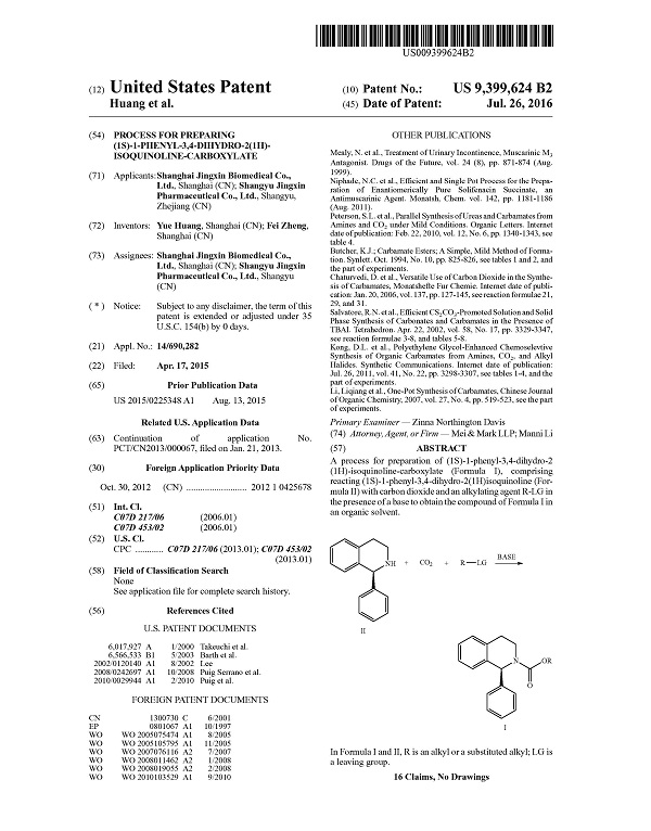近日,公司的PCT專利申請:PROCESS FOR PREPARING (1S)-1 -PHENYL-3,4-DIHYDRO-2(1H)-ISOQUINOLINE–CARBOXYLATE獲得美國專利商標局(USPTO)頒發(fā)的發(fā)明專利授權證書。專利授權公告號US9399624,為公司首件通過PCT途徑獲得國外授權的發(fā)明專利。