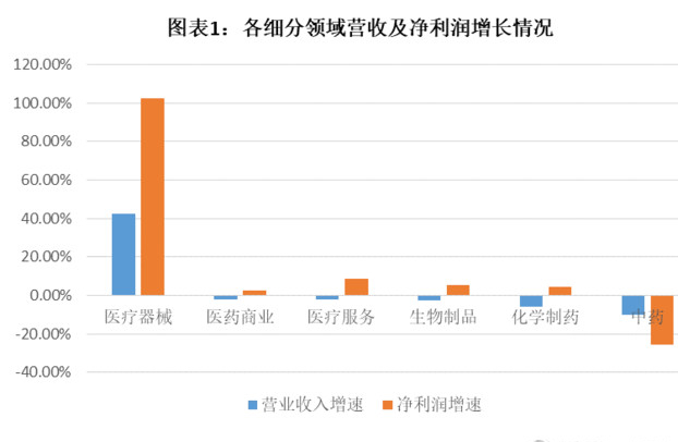 二、細分板塊:醫(yī)療器械一枝獨秀,中藥滑坡最大