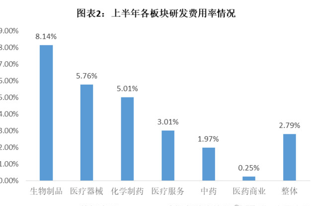 此外,中藥板塊研發(fā)投入力度偏低,也是削弱其長期競爭力,從而間接導(dǎo)致業(yè)績下滑的原因之一。如圖表2所示,上半年中藥板塊的研發(fā)費用占營業(yè)收入的比重僅為1.97%,僅高于醫(yī)藥商業(yè)板塊,遠低于生物制品(8.14%)和化學(xué)制藥板塊(5.01%)。