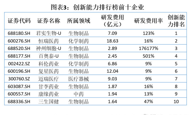 1. 創(chuàng)新榜:君實生物奪冠,生物制品領(lǐng)域研發(fā)投入普遍較高
